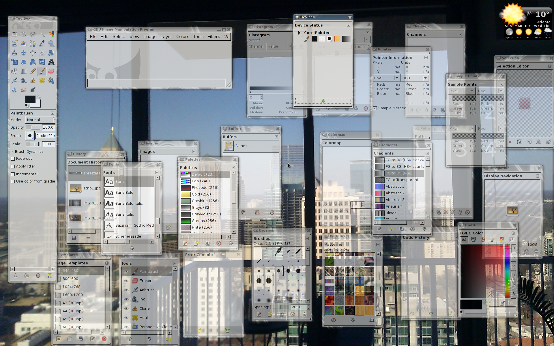 We know, however, that—compilers, editors and software RAID aside—things are rarely so easy on Linux. A few minutes into use of the GIMP, we find our workspace looking more like that to the right. We've reached Fucked Factor Five, cap'n, and bewilderment levels are approaching standard ISO/ANSI safety limits. Note that I have not yet actually opened an image, much less manipulated one. Note that listed tools include “Aneurism [sic] Gradients”, the “Ega Palette”, and the “orange swiss cheese? Pattern” (question mark not mine). Why create a gradient whose name one can't spell? Why a pattern whose name is unknown? Since when is Swiss cheese orange, and why would I want to pattern anything with it? Does “Ega” refer to the venerable Enhanced Graphics Adapter of lore, and if so why, and if not, what the devil is an Ega? These mysteries will have to be left for greater men than I.