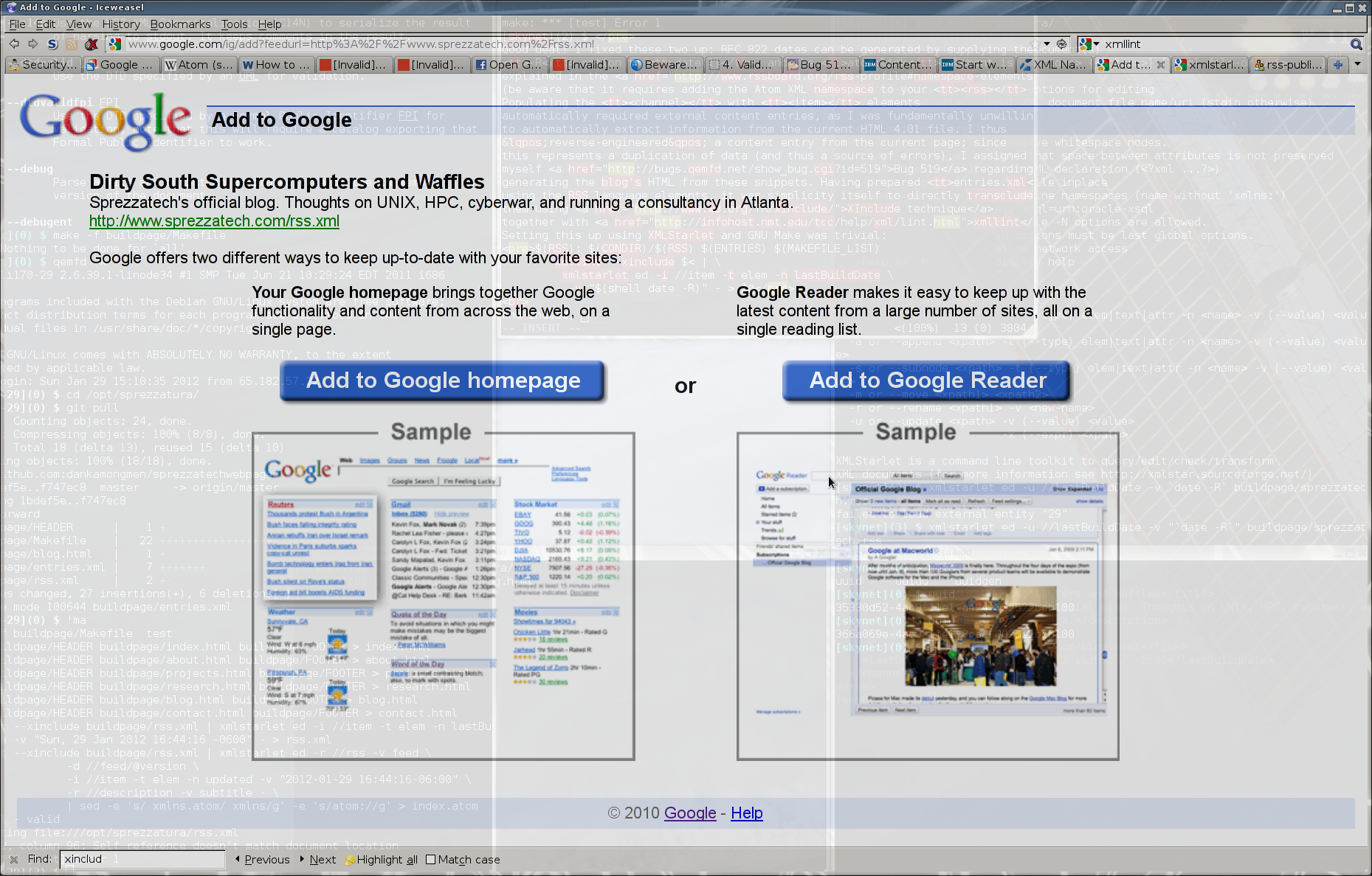 [skynet](0) $ make -f buildpage/Makefile test sprezzatech.rss - valid Validating file:///home/dank/src/sprezzatura/sprezzatech.rss line 8, column 24: lastBuildDate must be an RFC 822 date-time line 9, column 1: Missing atom:link with rel="self" make: *** [test] Error 1 [skynet](2) $Good deal! I fixed these two up: RFC 822 dates can be generated by supplying the -R option to date, and the <atom:link> element is explained in the RSS Best Practices (be aware that it requires adding the Atom XML namespace to your <rss> element). Populating the <channel> with <item> elements automatically required external content entries, as I was fundamentally unwilling to automatically extract information from the current HTML 4.01 file. I thus “reverse-engineered” a content entry from the current page; since this represents a duplication of data (and thus a source of errors), I assigned myself Bug 519 regarding generating the blog's HTML from these snippets. Having prepared entries.xml using the RSS language elements, it was simplicity itself to directly transclude them using XInclude technique together with xmllint. Setting this up using XMLStarlet and GNU Make was trivial: